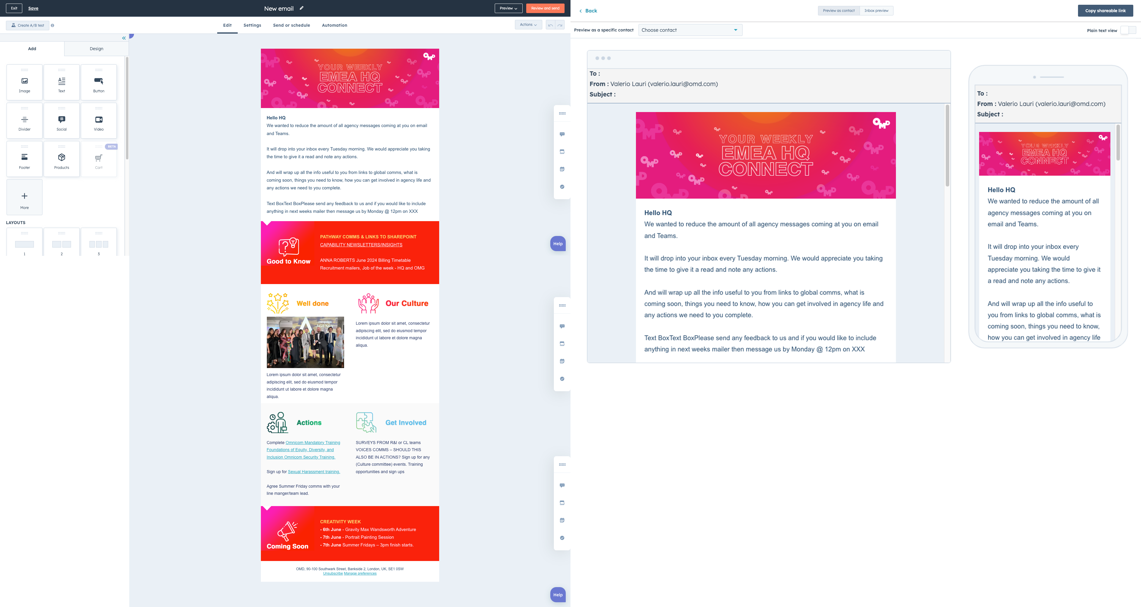 OMD internal communication, OMD EMEA weekly newsletter building on Hubspot platform